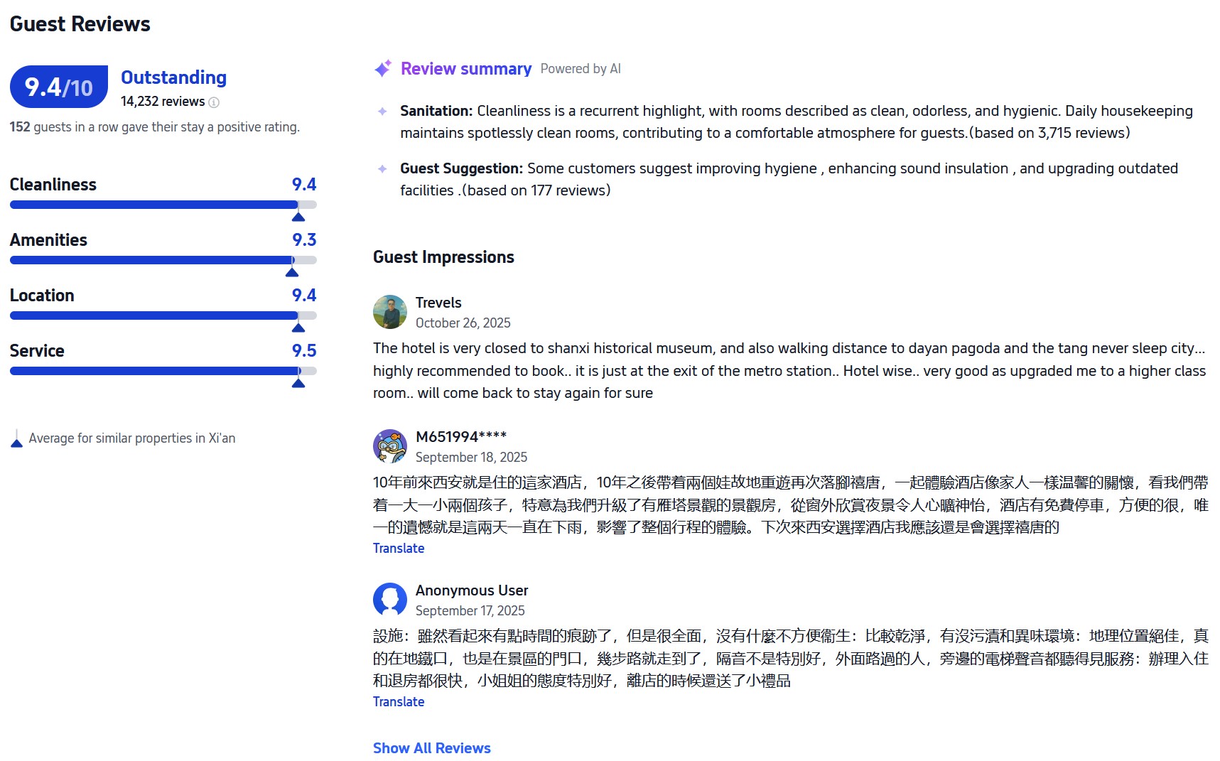 여러 가지 장점을 갖춘 호텔을 원하신다면 최적의 위치, 탁월한 서비스, 그리고 문화적 분위기 — 그리고 약간의 방음 문제는 괜찮으시다면 — 시탕 호텔은 탁월한 선택입니다.. 시안을 처음 방문하시든 10년 만에 다시 방문하시든, 14,000명이 넘는 투숙객으로부터 9.4/10이라는 높은 평점을 받은 따뜻한 환대, 깨끗한 객실, 세심한 배려를 그대로 경험하실 수 있습니다.